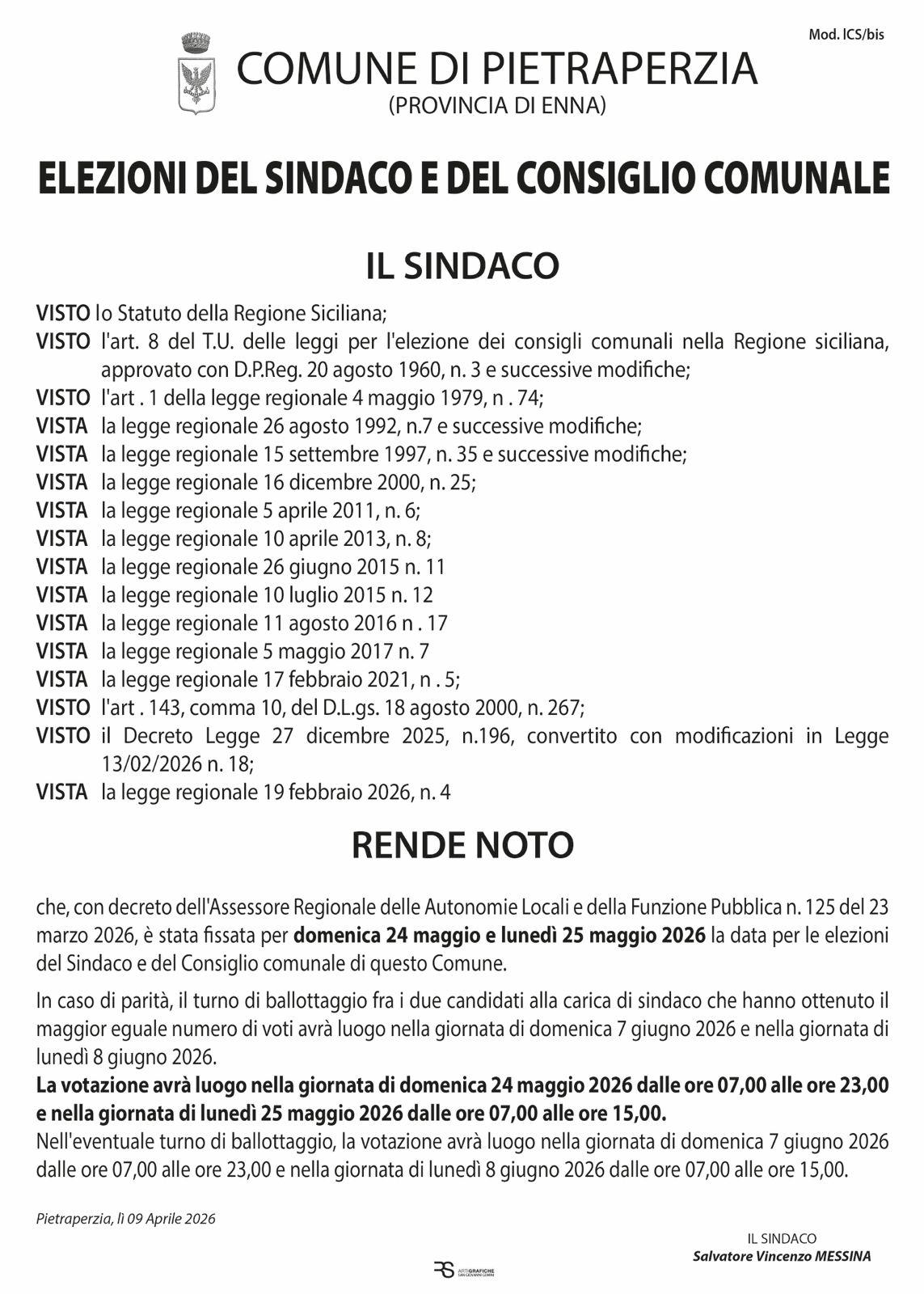 MANIFESTO ELEZIONE DEL SINDACO E DEL CONSIGLIO COMUNALE DEL 24-25 MAGGIO 2026